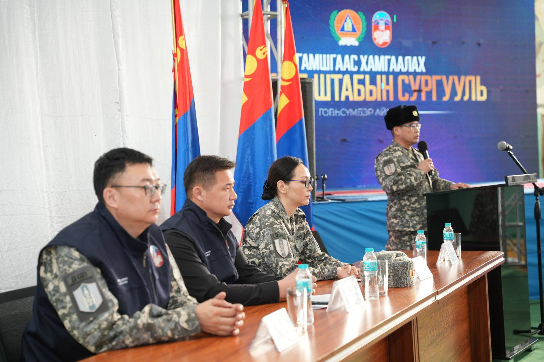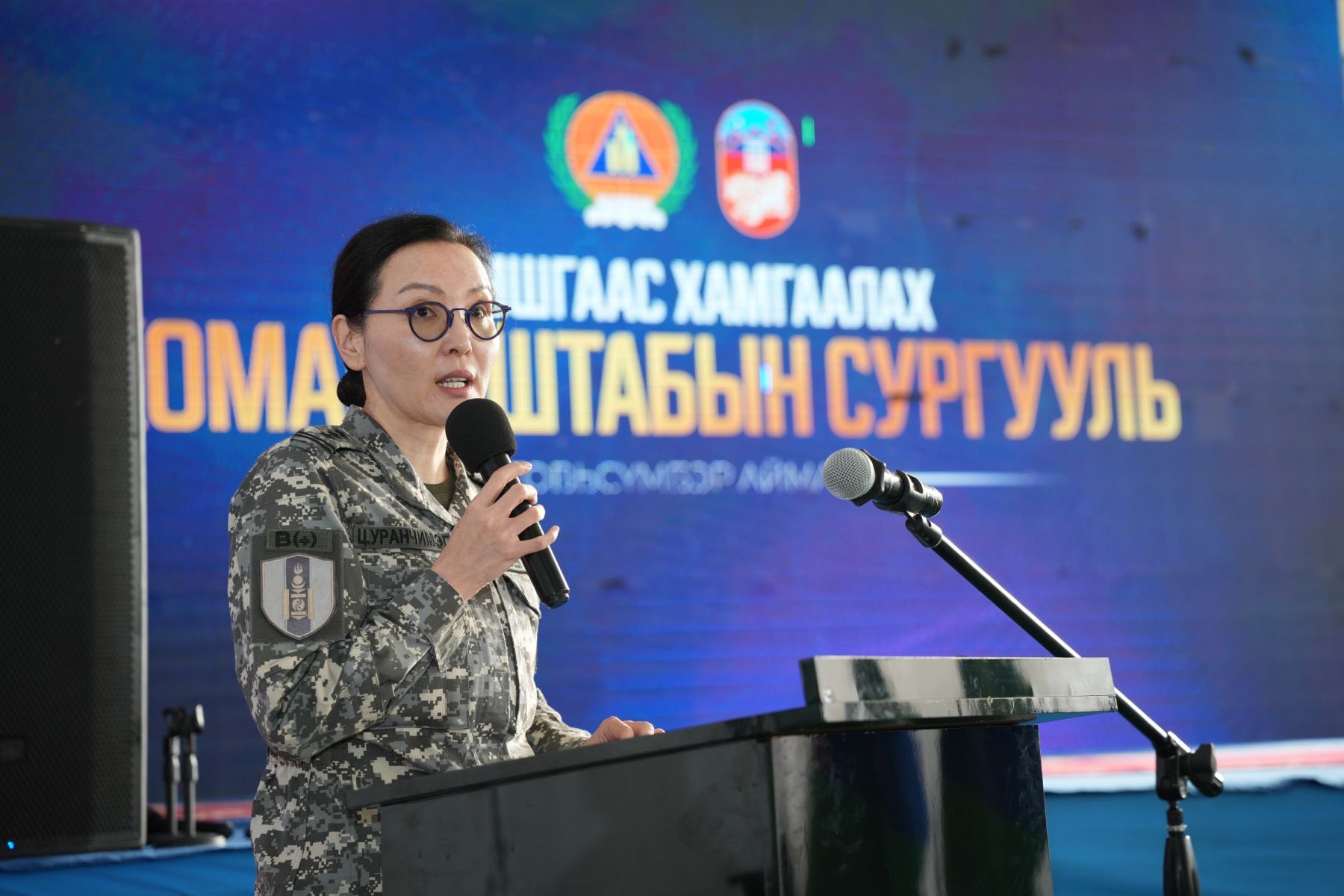 Хурандаа Ц.Уранчимэг хэлсэн үгэндээ “Уур амьсгалын өөрчлөлт, байгалийн болон технологийн гаралтай аюулт үзэгдэл, ослын давтамж, хор уршиг нэмэгдэж байгаа өнөөгийн нөхцөлд гамшгийн эрсдэлийг бууруулах, бэлэн байдлыг хангах, байгууллагуудын хамтын ажиллагааг бэхжүүлэхэд команд-штабын сургууль, дадлагын ач холбогдол өндөр байна. Говьсүмбэр аймгийн хэмжээнд сүүлийн 5 жилийн хугацаанд гамшиг, аюулт үзэгдэл, ослын нийт 240 удаагийн дуудлага бүртгэгдэж, 37 иргэн амь насаа алдаж, 1116 хүн гэмтэж бэртэн, өвчилж, 878 толгой мал хорогдон, 3.7 тэрбум төгрөгийн шууд хохирол учирсан. Бүртгэгдсэн тохиолдлын 50.4 хувийг обьектын гал түймэр, 15.8 хувийг цас, шаварт суусан дуудлага, 7.9 хувийг зам тээврийн осол, 7.5 хувийг төөрсөн, сураггүй болсон тохиолдол эзэлж байна. Түүнчлэн аймгийн хэмжээнд жилд дунджаар 48 удаагийн гамшиг, аюулт үзэгдэл, ослын дуудлага бүртгэгддэг бөгөөд хүн амын тоонд харьцуулахад 100.000 хүн амд жилд дунджаар 266 дуудлага ногдож байгаа нь улсын хэмжээнд аюулт үзэгдлийн тохиолдлоор эхний 5 аймгийн нэгт багтаж байна” хэмээн онцоллоо.
