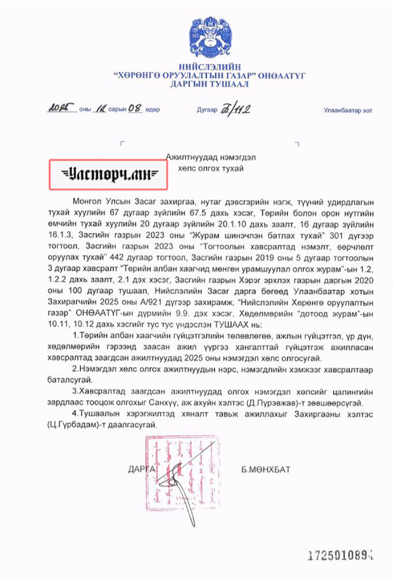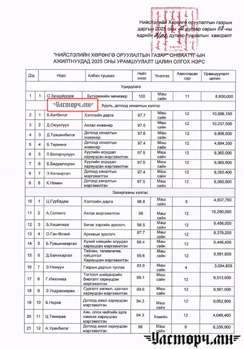 Тэдний дунд О.ЗУНДУЙДОРЖИЙГ 11 сарын хугацаанд 100% сайн ажилласан гэж үнэлээд 8,800 мянган төгрөгийн УРАМШУУЛАЛ олгосон байна.