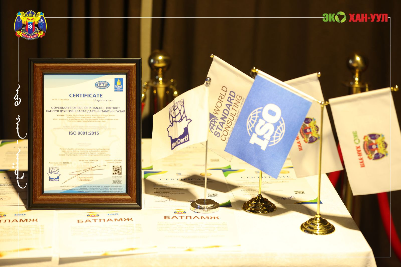 ХАН-УУЛ ДҮҮРГИЙН ЗАСАГ ДАРГЫН ТАМГЫН ГАЗАР ОЛОН УЛСЫН ЧАНАРЫН УДИРДЛАГЫН ISO 9001:2015 СТАНДАРТЫГ АМЖИЛТТАЙ НЭВТРҮҮЛЛЭЭ