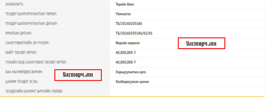ТӨРИЙН БАНК улс төрд нөлөө бүхий этгээдийн дата үйлчилгээ үзүүлэх 40 САЯЫН тендер зарлажээ.
