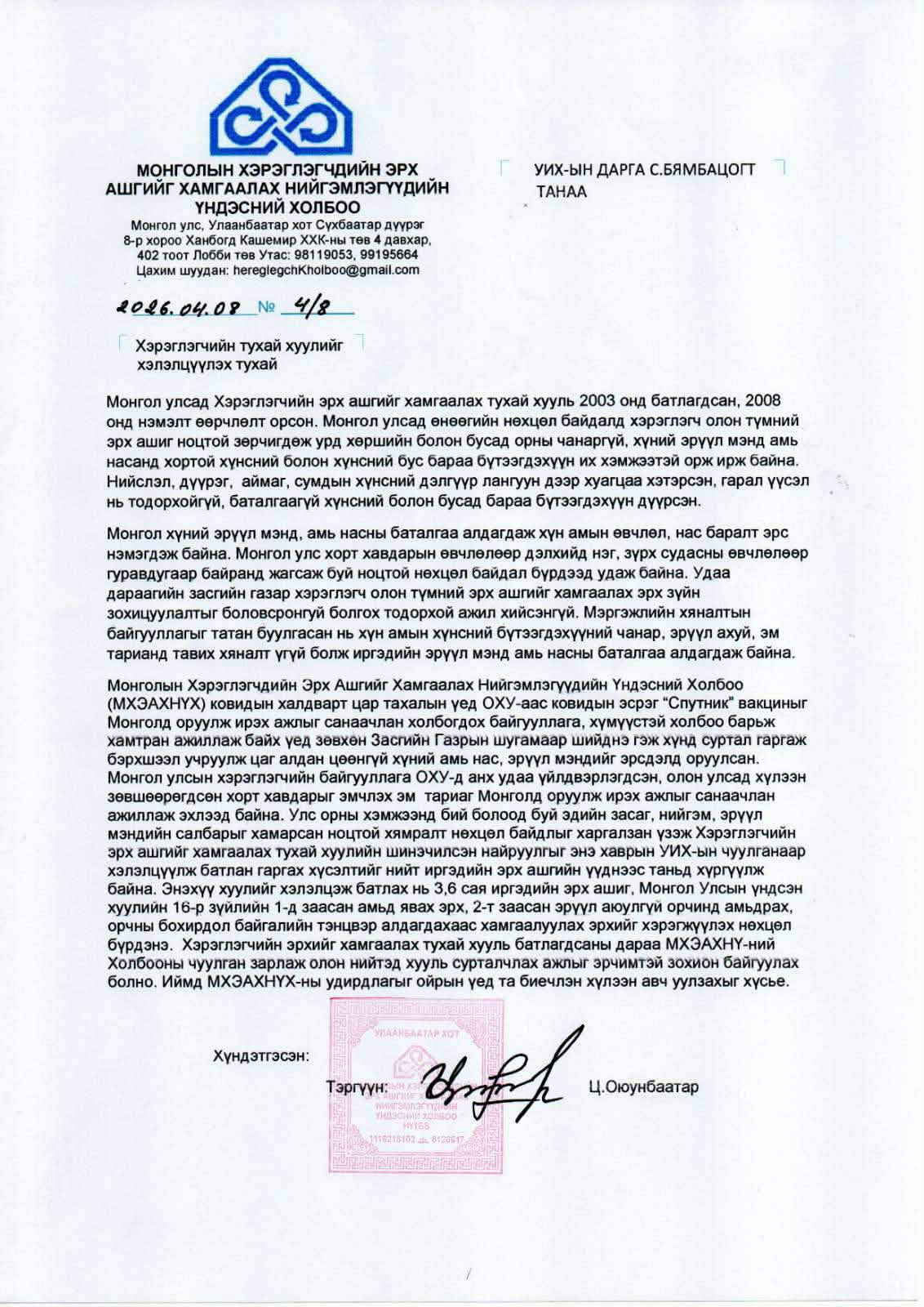 Монголын хэрэгчийн эрх ашгийг хамгаалах нийгэмлэгүүдийн холбооноос УИХ-ын дарга С.Бямбацогтод ханджээ.