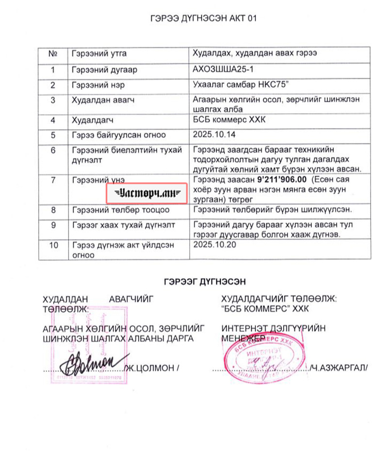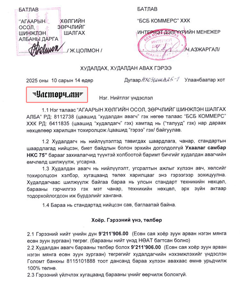 Агаарын хөлгийн осол гэмтлийг шинжлэн шалгах алба гэж төсвийн мөнгийг зүй бусаар зарцуулж, хэрэггүй зүйл худалдан авдаг газар байна. Энэ албаны дарга нь Ж.ЦОЛМОН гэдэг хүн байх бөгөөд 2025 оны 10 сарын 14-нд “БСБ КОММЕРС” ХХК интернет дэлгүүрийн менежер Ч.АЗЖАРГАЛТАЙ худалдах, худалдан авах гэрээ байгуулж 9 сая 211 мянган төгрөгөөр “Ухаалан самбар” худалдан авчээ.