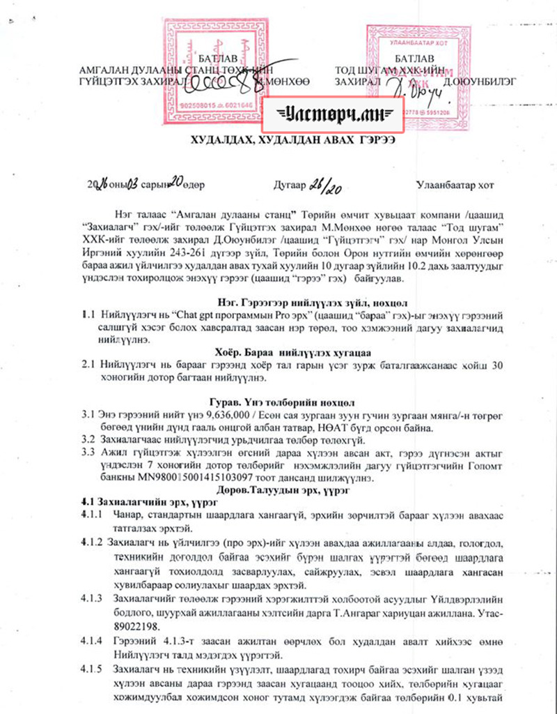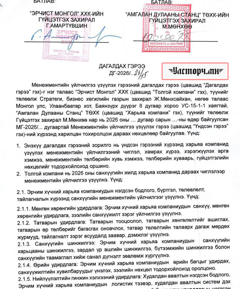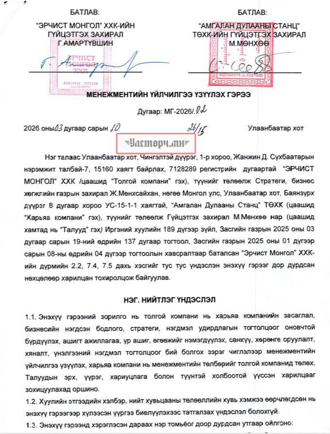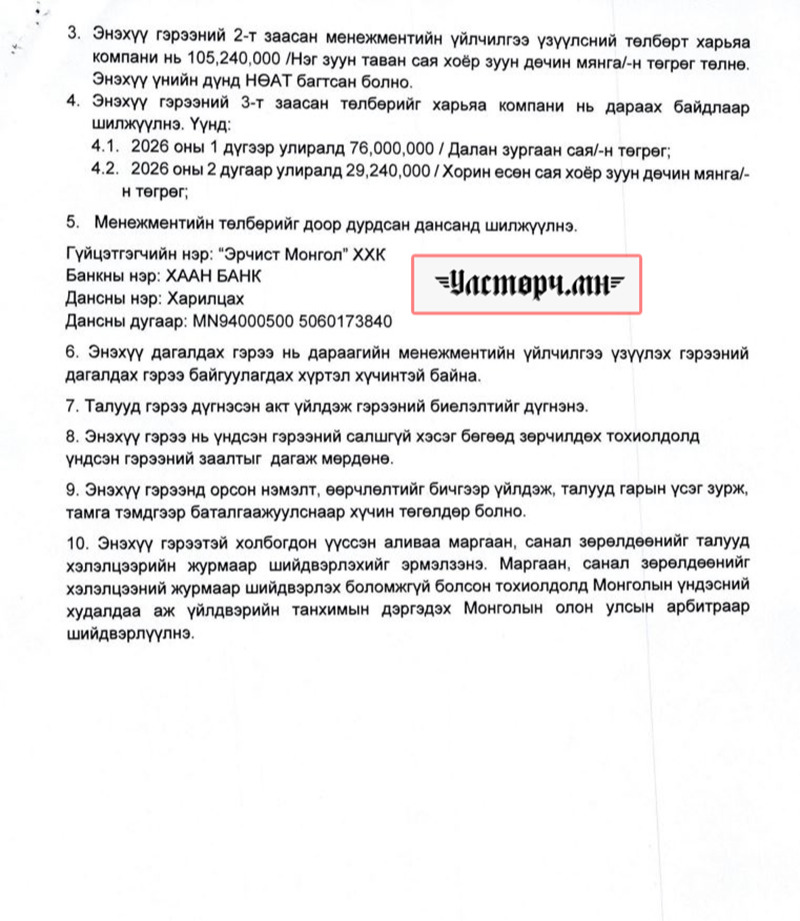 Үүнээс гадна нэг анхаарал татахуйц ХУУЛЬ БУС зүйл бол татан буугдсан компани руу ИХ ХЭМЖЭЭНИЙ МӨНГӨ ШИЛЖҮҮЛСЭН ноцтой зөрчил гаргажээ. Тодруулбал, 2026 оны гуравдугаар сарын 10-нд гэрээ байгуулж 105 сая төгрөг шилжүүлэхээр тохиролцож, улмаар 76 сая төгрөгийг нь шилжүүлчихжээ. Тус гэрээ байгуулсан “Эрчист Монгол” ХК-ийг 2026 оны гуравдугаар сарын 18-нд Г.Занданшатарын Засгийн газраас ТАТАН БУУЛГАХ шийдвэр гаргасан байдаг.