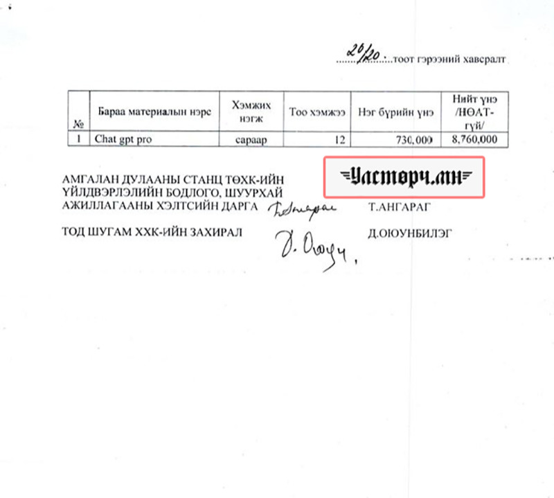 Монгол Улсын Засгийн газраас төрийн өмчит компаниуд, төрийн бүх байгууллагуудыг ХЭМНЭЛТИЙН ГОРИМД шилжүүлээд байгаа. Үндсэндээ хий хоосон, онц шаардлагагүй зүйлд МӨНГӨ ЗАРЛАГАДАХЫГ ор тас хориглосон гэсэн үг. Хориглосон ХУУЛЬ, Засгийн шийдвэр нь бий. Гэтэл “Амгалан” дулааны станцын гүйцэтгэх захирал М.МӨНХӨӨ гэгч эрхэм “хиймэл оюун ухаан” ашиглах нэрийдлээр төсвийн 9 сая 600 мянган төгрөгөөр “Chatgpt pro”-ийн 12 сарын эрх худалдан авчээ.