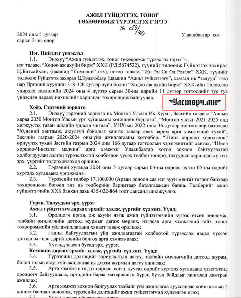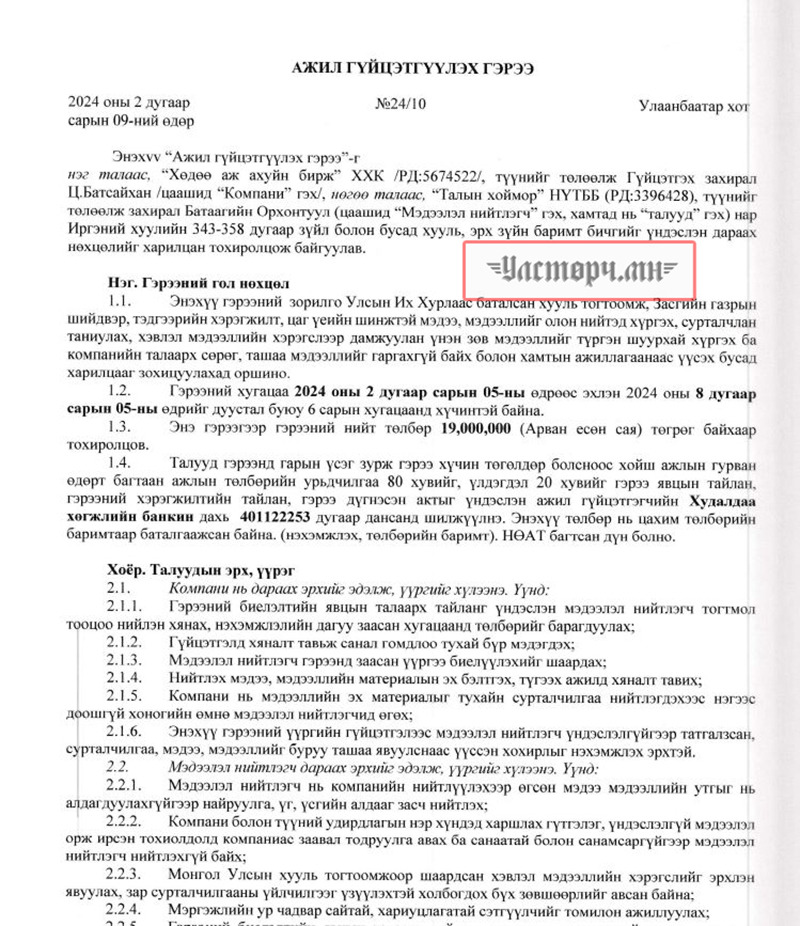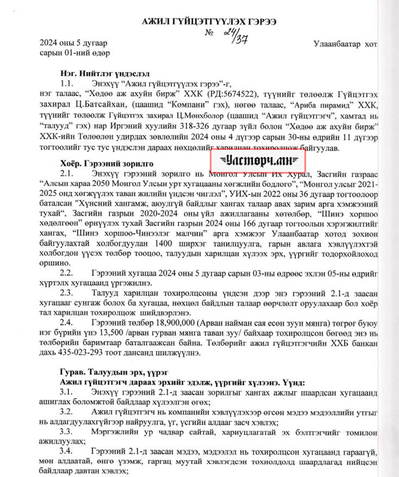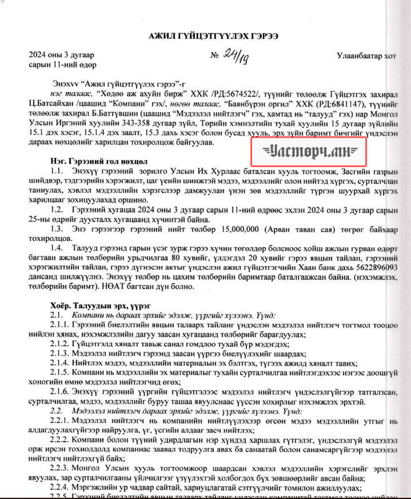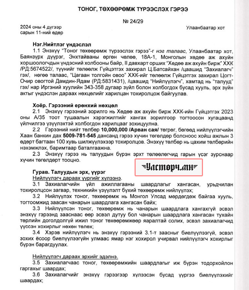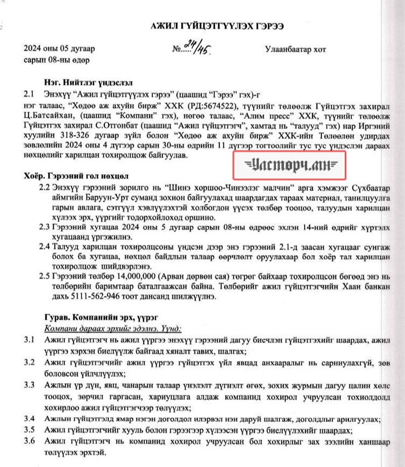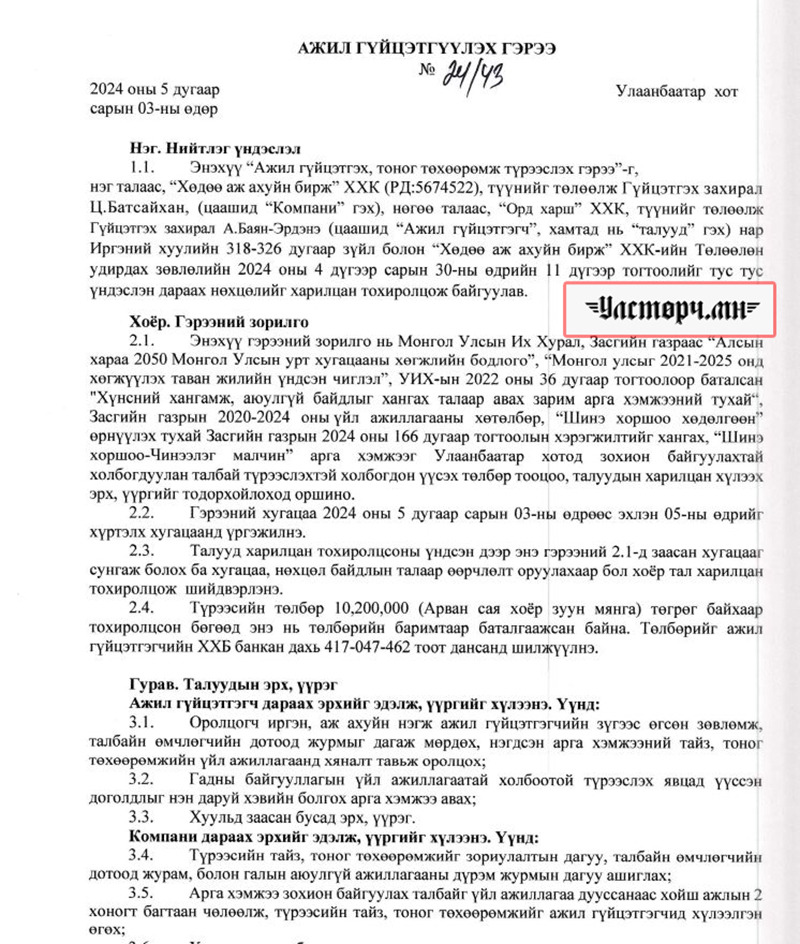 2024 оны 03 дугаар сарын 11-ний өдөр Хөдөө аж ахуйн бирж ХХК-ийн захирал Ц.БАТСАЙХАН нь “Баянбүрэн оргил” ХХК-ийн захирал Б.Баттүвшинтэй 24/19 тоот ажил гүйцэтгэх гэрээ байгуулж 15 сая төгрөг шилжүүлсэн бол өмнөх хоёрдугаар сард нь 24/07 дугаартай гэрээ хийж Б.Баттүвшинд хувьд нь мөн таван сая төгрөг гаргаж өгсөн байна.
