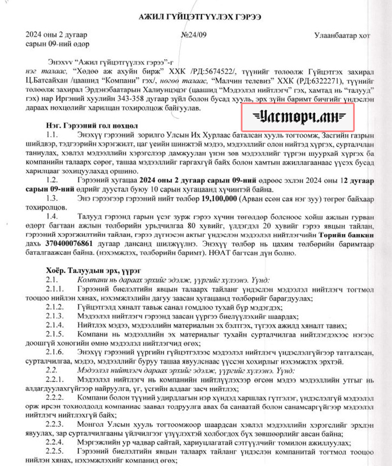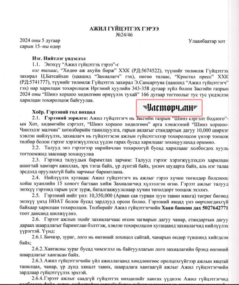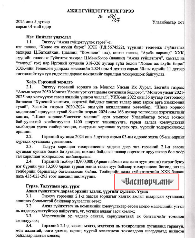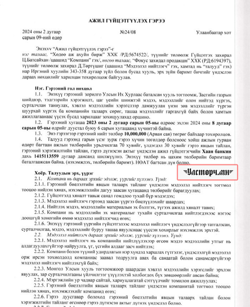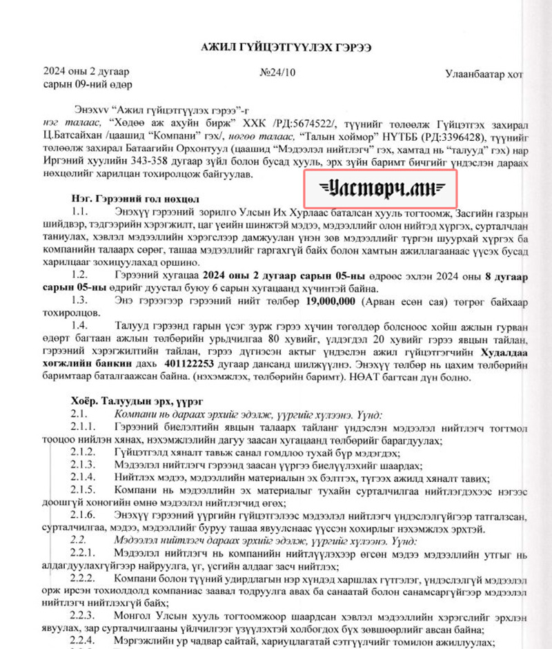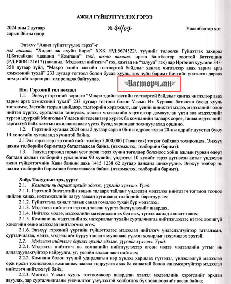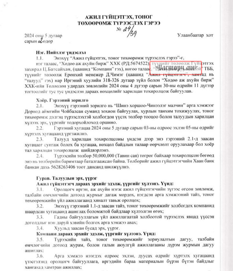 2024 оны 03 дугаар сарын 11-ний өдөр Хөдөө аж ахуйн бирж ХХК-ийн захирал Ц.БАТСАЙХАН нь “Баянбүрэн оргил” ХХК-ийн захирал Б.Баттүвшинтэй 24/19 тоот ажил гүйцэтгэх гэрээ байгуулж 15 сая төгрөг шилжүүлсэн бол өмнөх хоёрдугаар сард нь 24/07 дугаартай гэрээ хийж Б.Баттүвшинд хувьд нь мөн таван сая төгрөг гаргаж өгсөн байна.