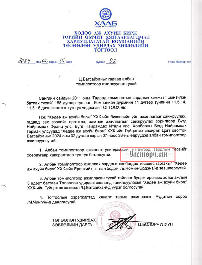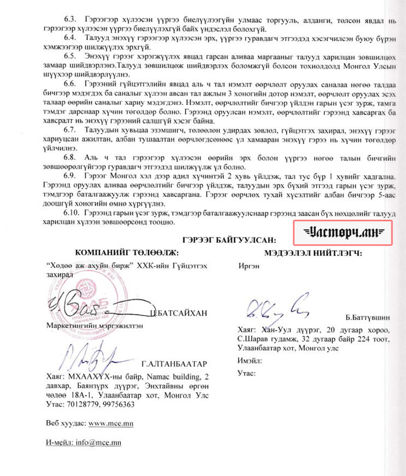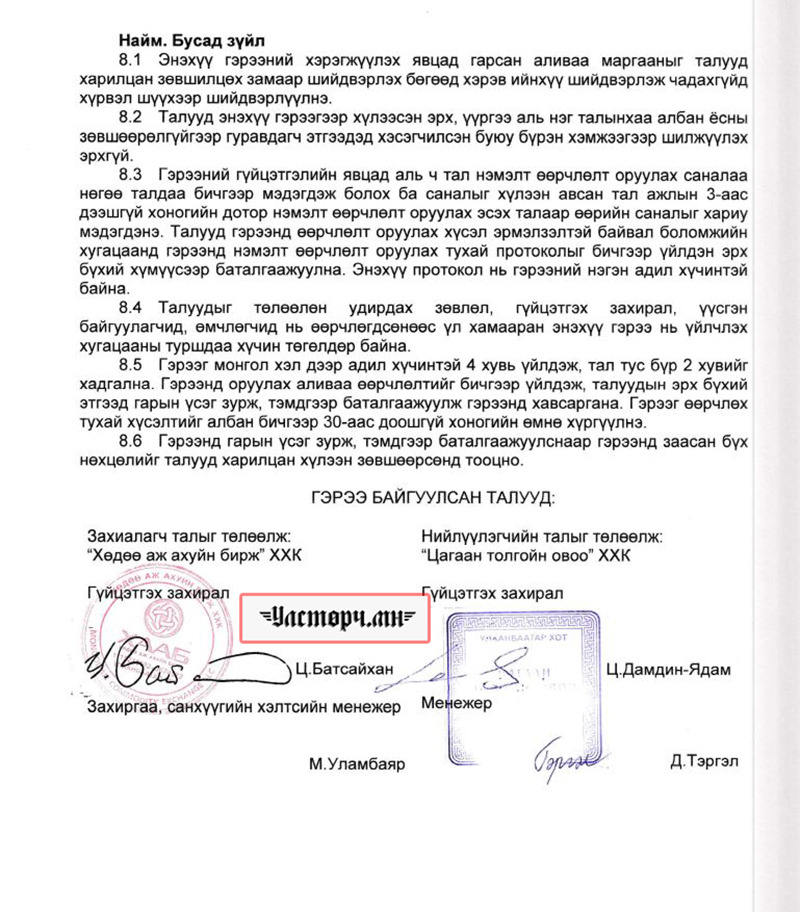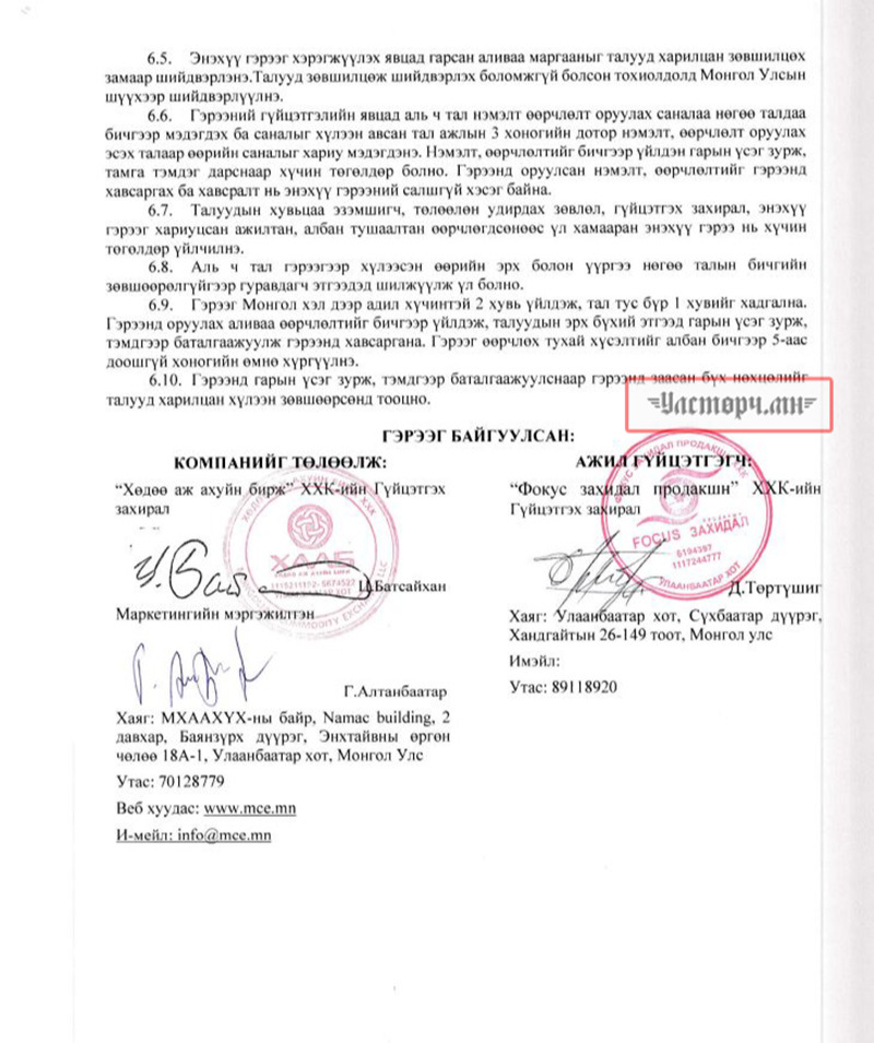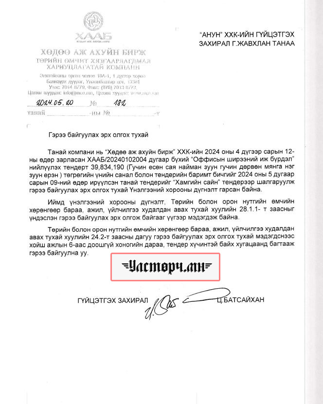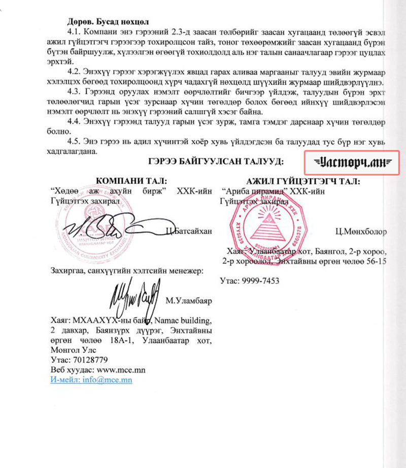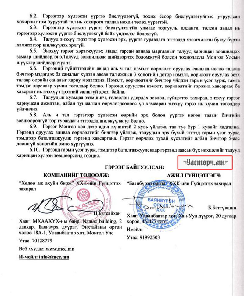 2024 оны 03 дугаар сарын 11-ний өдөр Хөдөө аж ахуйн бирж ХХК-ийн захирал Ц.БАТСАЙХАН нь “Баянбүрэн оргил” ХХК-ийн захирал Б.Баттүвшинтэй 24/19 тоот ажил гүйцэтгэх гэрээ байгуулж 15 сая төгрөг шилжүүлсэн бол өмнөх хоёрдугаар сард нь 24/07 дугаартай гэрээ хийж Б.Баттүвшинд хувьд нь мөн таван сая төгрөг гаргаж өгсөн байна.