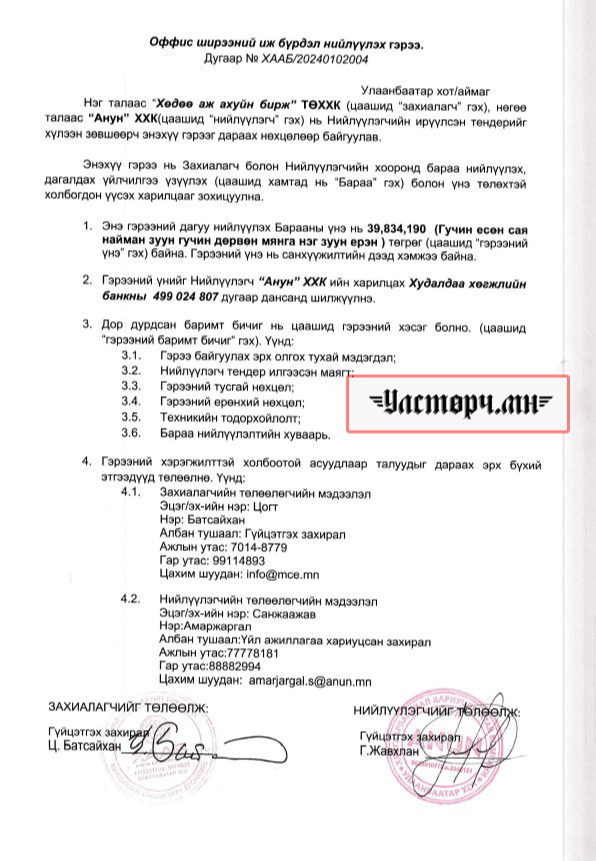 Түүнчлэн 2024 оны 05 дугаар сарын 20-ний өдөр “АНУН” ХХК-иас оффисийн ширээний иж бүрдэл” гэх утгаар 39 сая 834 мянгаар ШИРЭЭ САНДАЛ авсан. 2024 оны 05 дугаар сарын 15-нд “Шинэ хоршоо-Чинээлэг малчин” хөтөлбөрийн 10.000 танилцуулга хэвлүүлэхээр “Кристалл пресс” ХХК-тай 10 сяа 350 мянган төгрөгийн гэрээ байгуулсан. 2024 оны 05 сарын 08-нд “Алим пресс” ХХК-тай гарын авлага, танилцуулга, брошур хэвлүүлэхээр 14 сая төгрөг, 2024 оны 05 сарын 03-ний өдөр 24/43 тоот “ажил гүйцэтгүүлэх гэрээ”-г “Орд харш” ХХК руу 10 сая 200 мянган төгрөг, мөн нэр бүхий мэдээллийн сайттай хоёр өдрийн арга хэмжээг 50 сая төгрөгөөр дамжуулах гэрээ байгуулсан, 2024 оны 05 сарын 01-нд “Ариба пирамид” ХХК-тай 18 сая 900 мянган төгрөгөөр тус тус гэрээлжээ.