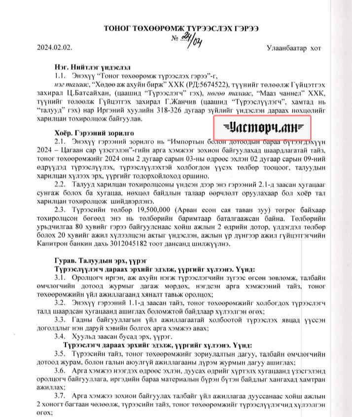 2024 оны 02 дугаар сарын 09-ний өдөр 24/10 тоот ажил гүйцэтгэх гэрээгээр “Талын хиймор” НҮТББ-ын данс руу 19 сая төгрөг шилжүүлсэн. 2024 оны 02 дугаар сарын 02-ний өдөр “Мааз чаннел” ХХК-ийн захирал Г.Жанчивтай 19 сая 500 мянган төгрөгөөр тоног төхөөрөмж түрээслэх гэрээ байгуулсан.