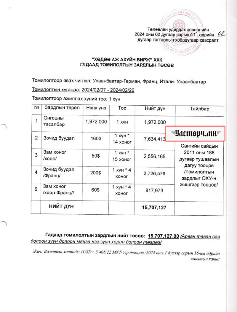Дээрх баримтуудаас хамгийн анхаарал татахуйц нь төсвийн 15 сая төгрөгөөр гадаад зах зээлийг өргөтгөх, компанийн бизнесийн үйл ажиллагааг сайжруулах гэсэн агуулгаар “Хөдөө аж ахуйн бирж” ХХК-ийн захирал Ц.Батсайхан нь 21 хоног Герман, Итали, Франц зэрэг орнуудад АЯЛАЖ байгаад ирсэн байдаг. Түүнийг явуулсан этгээд нь ХААБ-ийн ТУЗ-ийн дарга одоогийн ХХААХҮЯ-ны бодлогын хэрэгжилтийн газрын дарга Ц.БОЛОРЧУЛУУН гэгч юм.
