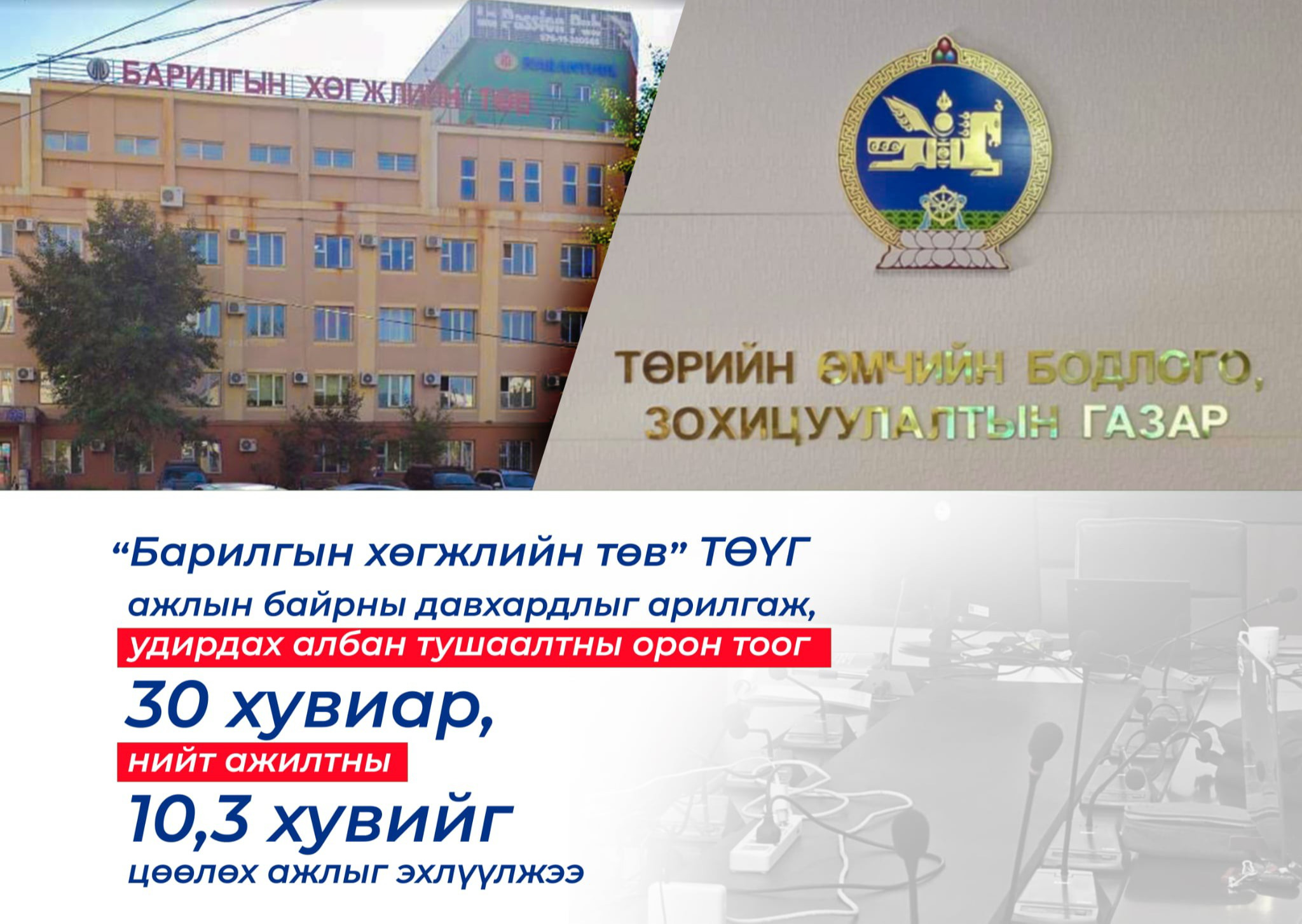 “БАРИЛГЫН ХӨГЖЛИЙН ТӨВ” ТӨҮГ АЖЛЫН БАЙРНЫ ДАВХАРДЛЫГ АРИЛГАЖ, УДИРДАХ АЛБАН ТУШААЛТНЫ ОРОН ТООГ 30 ХУВИАР, НИЙТ АЖИЛТНЫ 10,3 ХУВИЙГ ЦӨӨЛӨХ АЖЛЫГ ЭХЛҮҮЛЖЭЭ