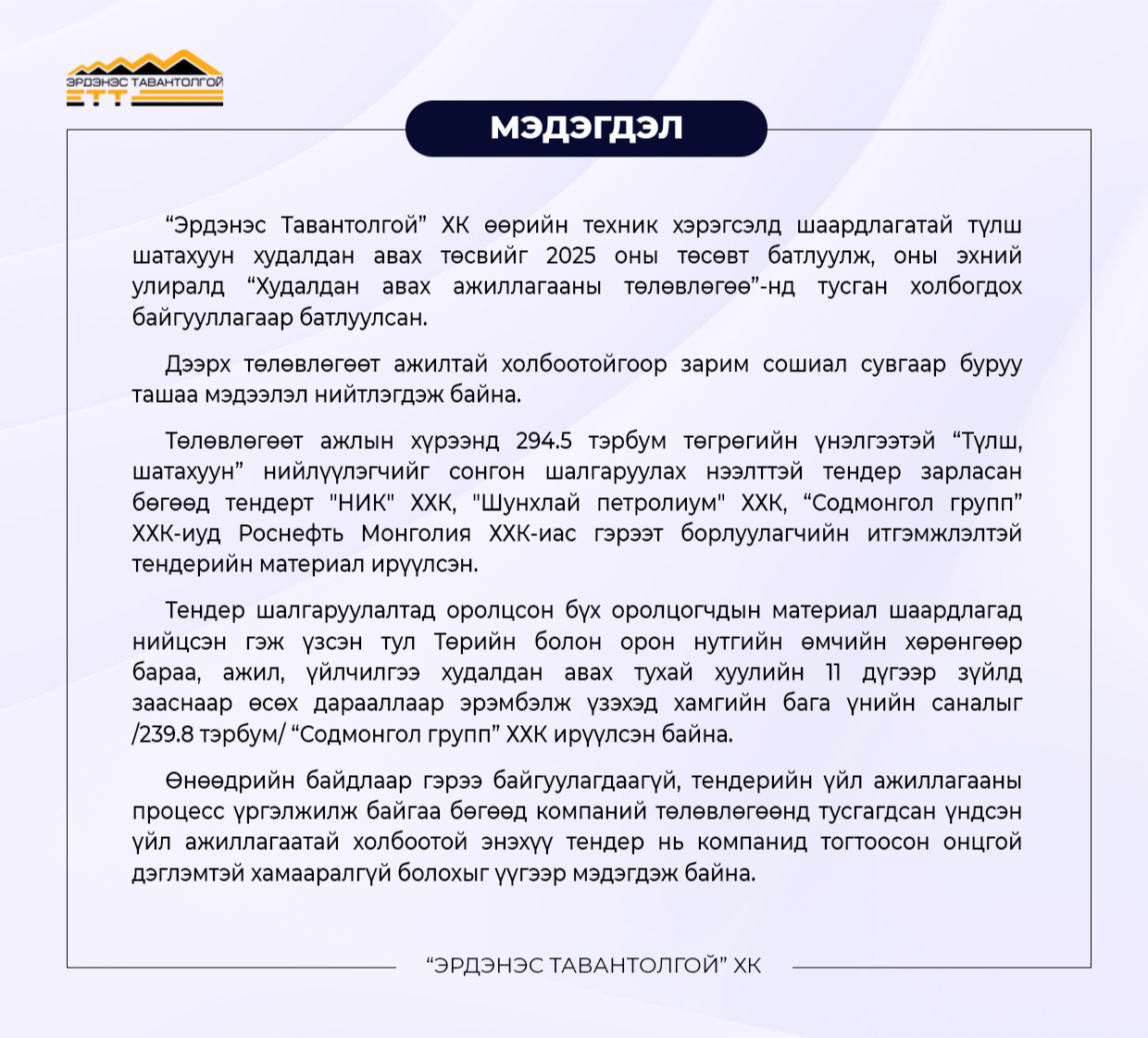 "Эрдэнэс Тавантолгой" ХК-иас МЭДЭГДЭЛ ГАРГАЛАА