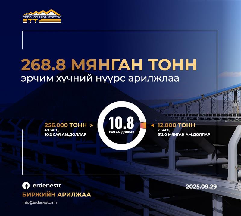 "ЭРДЭНЭС ТАВАНТОЛГОЙ" ХК 10.8 САЯ АМ.ДОЛЛАРЫН ҮНИЙН ДҮН БҮХИЙ 268.8 МЯНГАН ТОНН НҮҮРС АРИЛЖЛАА