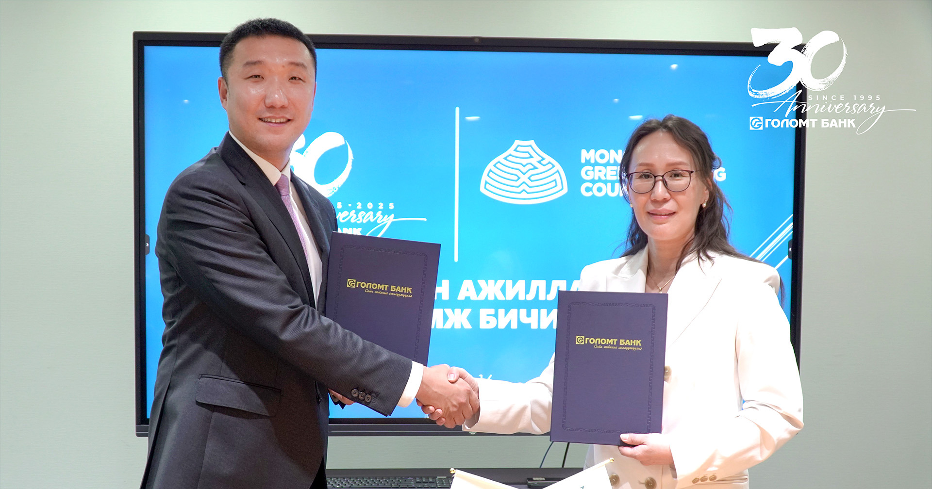 Голомт банкны гүйцэтгэх захирал А.Одонбаатар болон Монголын Ногоон Барилгын Хүрээлэнгийн гүйцэтгэх захирал Ц.Батгэрэл нар хамтын ажиллагааны санамж бичгийг есдүгээр сарын 16-нд үзэглэлээ.