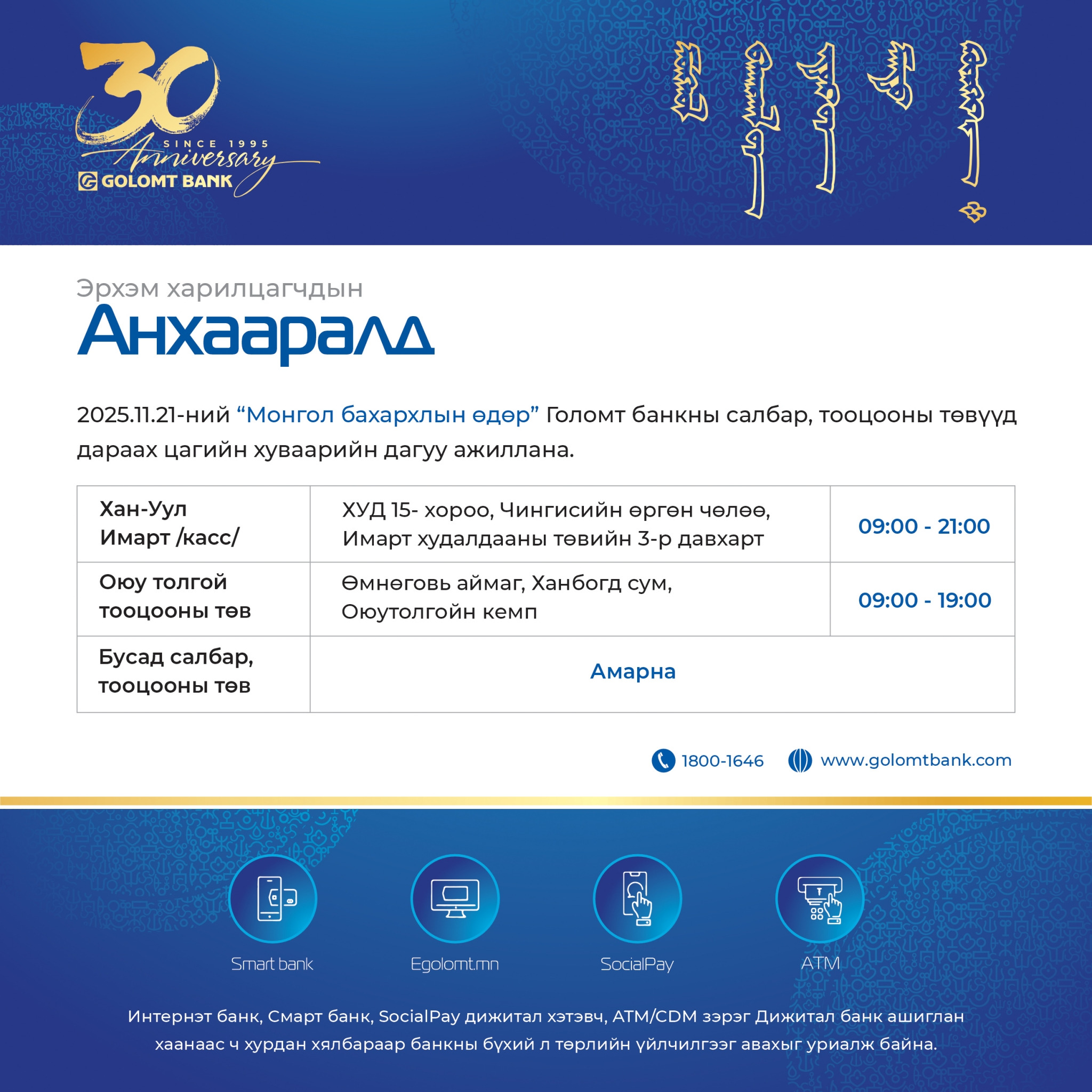 Монгол бахархлын өдөр Голомт банкны салбар нэгжүүдийн ажиллах цагийн хуваарь