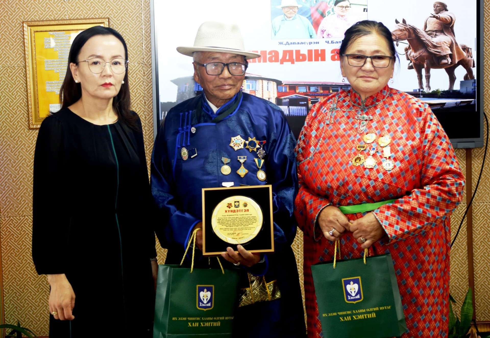 Эх орныхоо хөгжил дэвшил, сайн сайхан амьдралын төлөө чин шударгаар хөдөлмөрлөсөн хичээл зүтгэлийн илэрхийлэл болгож “Хөдөлмөр алдар”-аа тэмдэглүүлж буй Хэрлэн сумын 3 дугаар багийн ахмад настан Жамъянжав овогтой Даваасүрэн, Чүлтэмсүрэн овогтой Баясгалан нарт аймгийн Засаг даргын зүгээс хүндэтгэл үзүүлж гарын бэлэг хүргүүллээ.